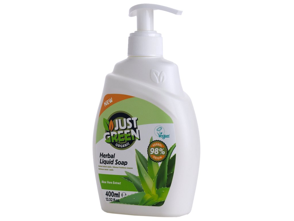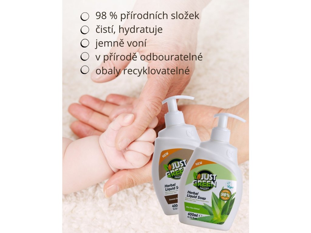 Přírodní tekuté mýdlo na ruce Just Green Organic obsahuje 98 % přírodních složek a je vhodné pro všechny typy pokožky. Hydratuje pokožku díky výtažkům z listů aloe vera a zajišťuje potřebnou očistu rukou, těla i vlasů. Snadno se oplachuje a díky příjemné vůni dodává přirozený svěží pocit. Toto tekuté mýdlo na ruce je v přírodě biologicky odbouratelné a tím extrémně šetrné k přírodě, neobsahuje přísady a chemikálie. Poskytuje zdravé a bezpečné mytí pro celou rodinu včetně miminek.