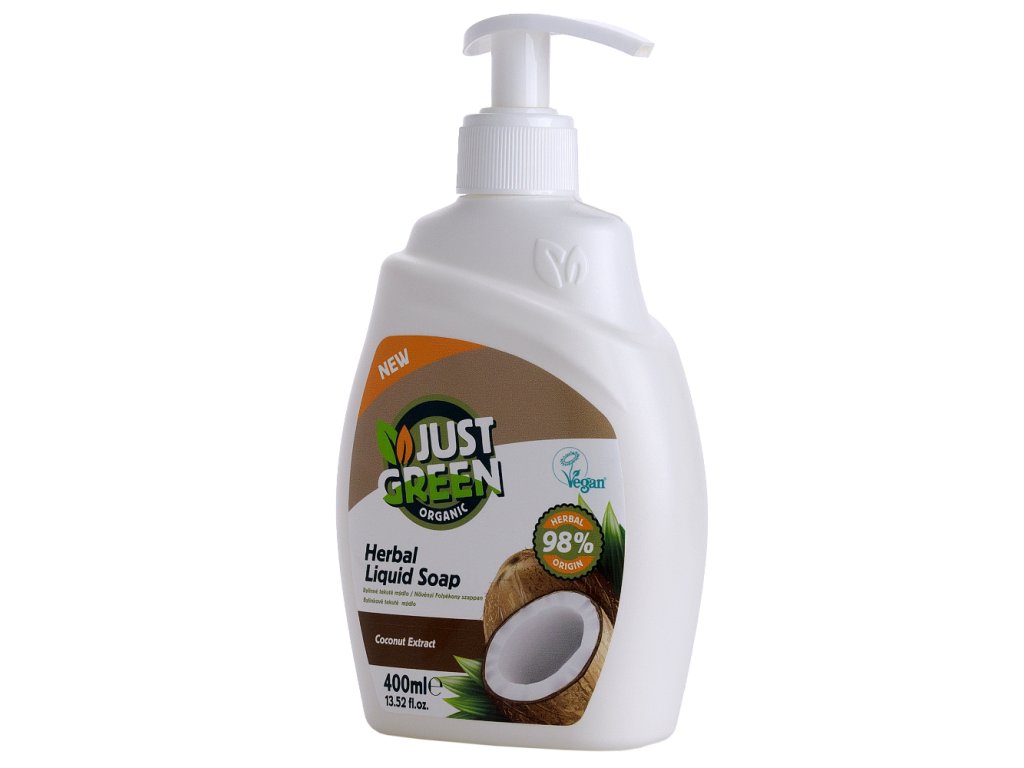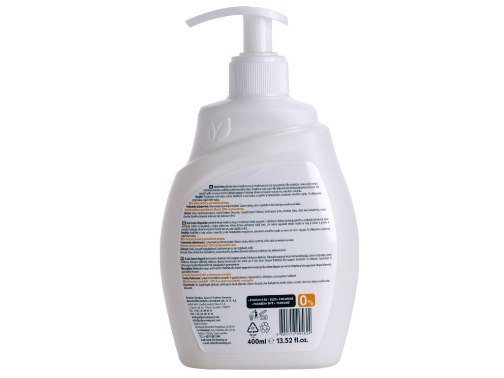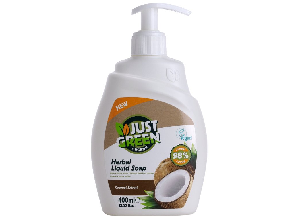 Přírodní tekuté mýdlo na ruce Just GreenOrganicobsahuje 98 % přírodních složek a je vhodné pro všechny typy pokožky. Hydratuje pokožku díky výtažkům z kokosových ořechů a zajišťuje potřebnou očistu rukou, těla i vlasů. Snadno se oplachuje a díky příjemné vůni dodává přirozený svěží pocit. Toto tekuté mýdlo na ruce je v přírodě biologicky odbouratelné a tím extrémně šetrné k přírodě, neobsahuje přísady a chemikálie. Poskytuje zdravé a bezpečné mytí pro celou rodinu včetně miminek.